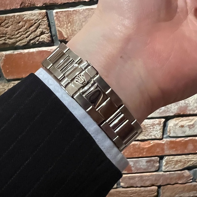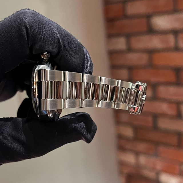 ブレスレットは中央が鏡面仕上げとなっており、白文字盤と相まって気品を感じます。