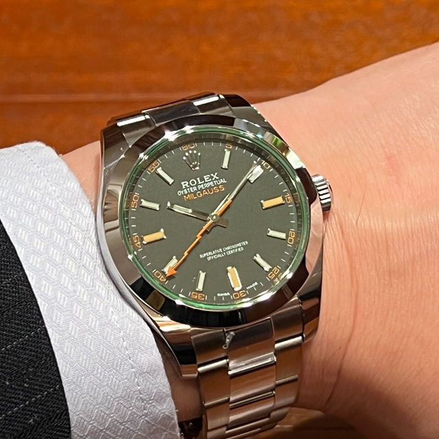 また、バックケースの外周部分には「ROLEX」、「MILGAUSS」、そして王冠マークが